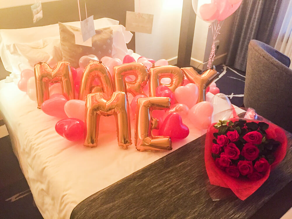 バルーンの装飾の中に指輪の箱をこっそり忍ばせて置いておいて、バルーンの装飾で驚いている彼女にそのままひざまずいてプロポーズを、、、。