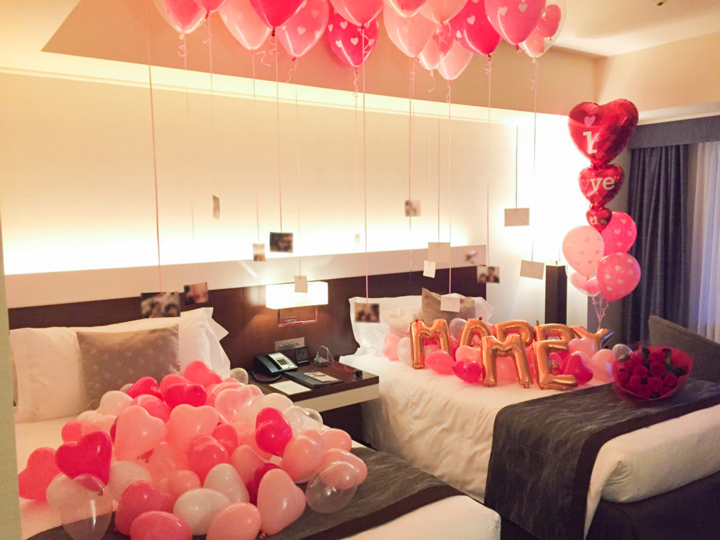 彼女の知らない間にホテルや自宅の部屋いっぱいにバルーンを飾って、帰ってきた彼女へのサプライズ。