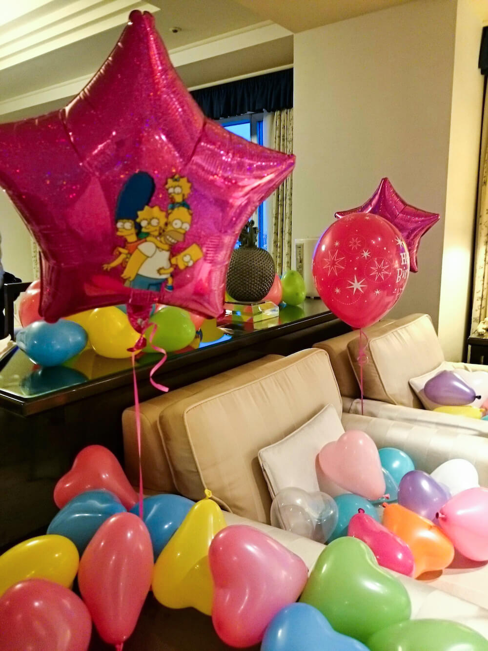 奥様の好きな『シンプソンズ』のシールを作り、バルーンに貼りつけてオリジナルバルーンをつくって装飾いたしました。