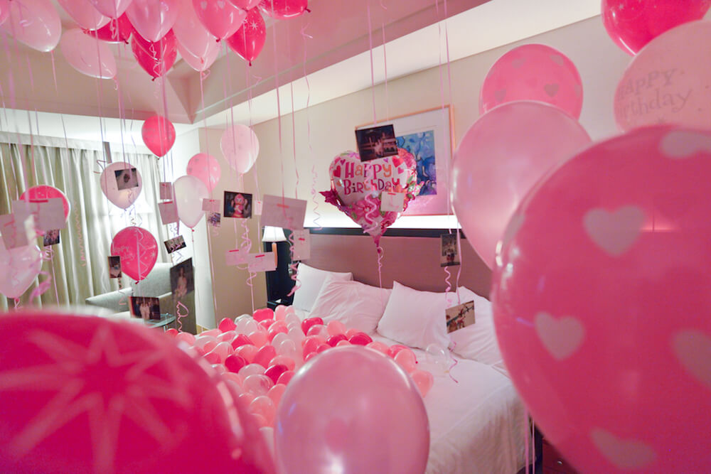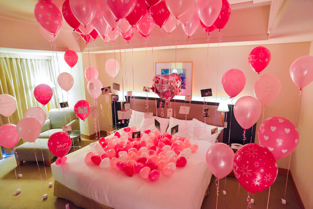 お部屋は彼女様のお好きなピンクグラデーションでご用意し、愛がいっぱいの空間となりました。お二人のお写真が加わるだけで、オリジナル感がでてより一層、感動していただけるのではないでしょうか。