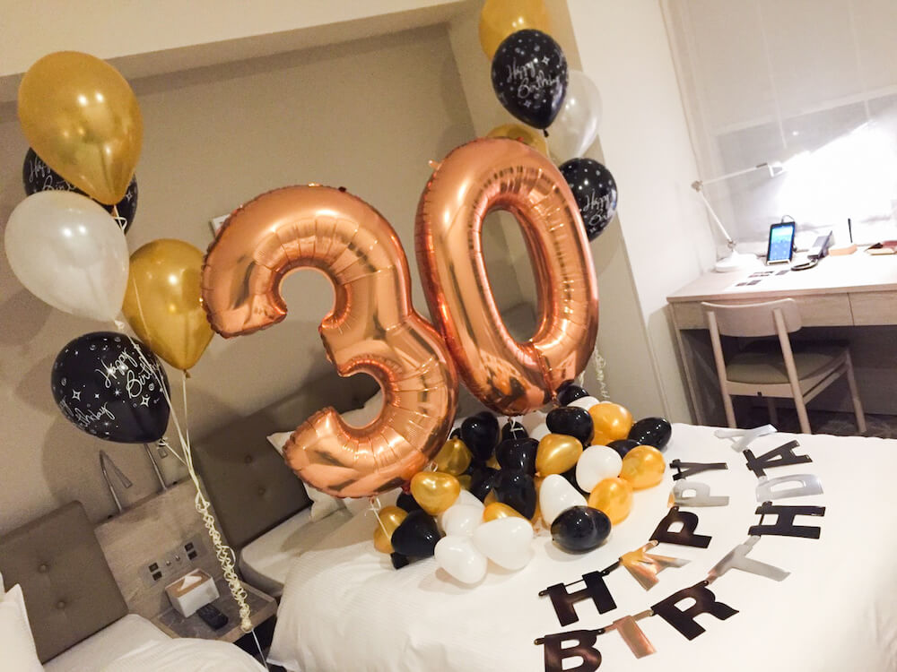 No.206 ゴールドホワイトブラック系バルーンでホテルサプライズ
