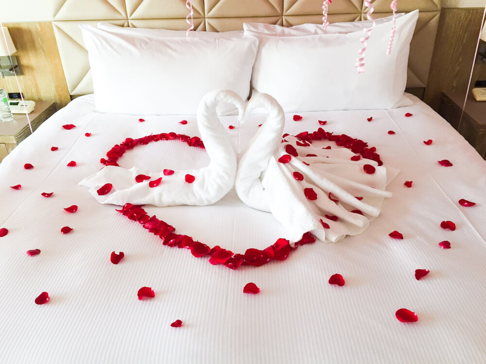 ②ベッド上:バスタオルアート(白鳥2羽) 2,000円