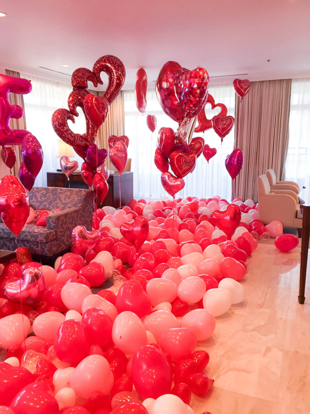 お部屋をバルーンでいっぱいにしたい。大切な人へ日頃の感謝と愛を込めてプレゼントをしたいというご希望をいただき、お部屋の中が愛であふれている空間をお作りさせていただきました。両扉の入り口を開けるとそこには自分の名前、そして床中に敷き詰められた風船のじゅうたん、とてもラブリーな空間になりました。日頃の感謝を伝えるアイテムの一つとして、ぜひサプライズしてみてください。