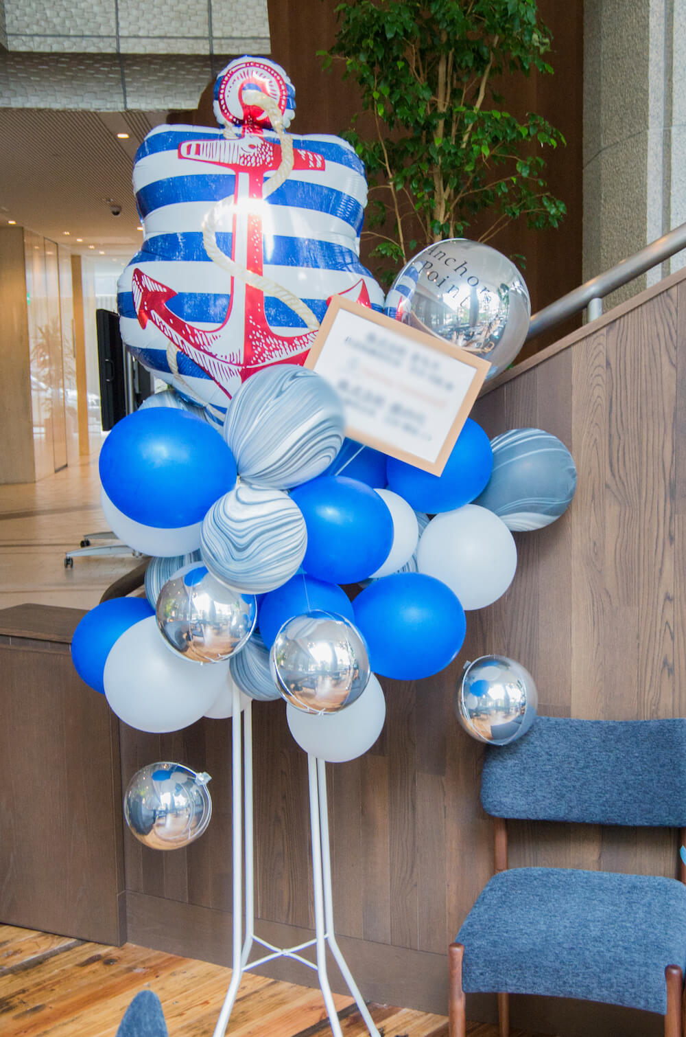 お店のオープン祝いにバルーンスタンドをお届けしました。 海をイメージしたバルーンに、都会的でオシャレなお店の雰囲気に合うように、シルバーの球体バルーンをアクセントとして取り入れました。