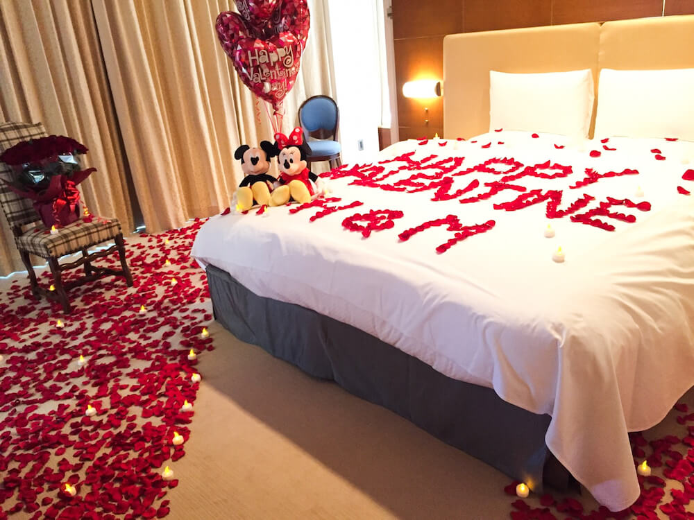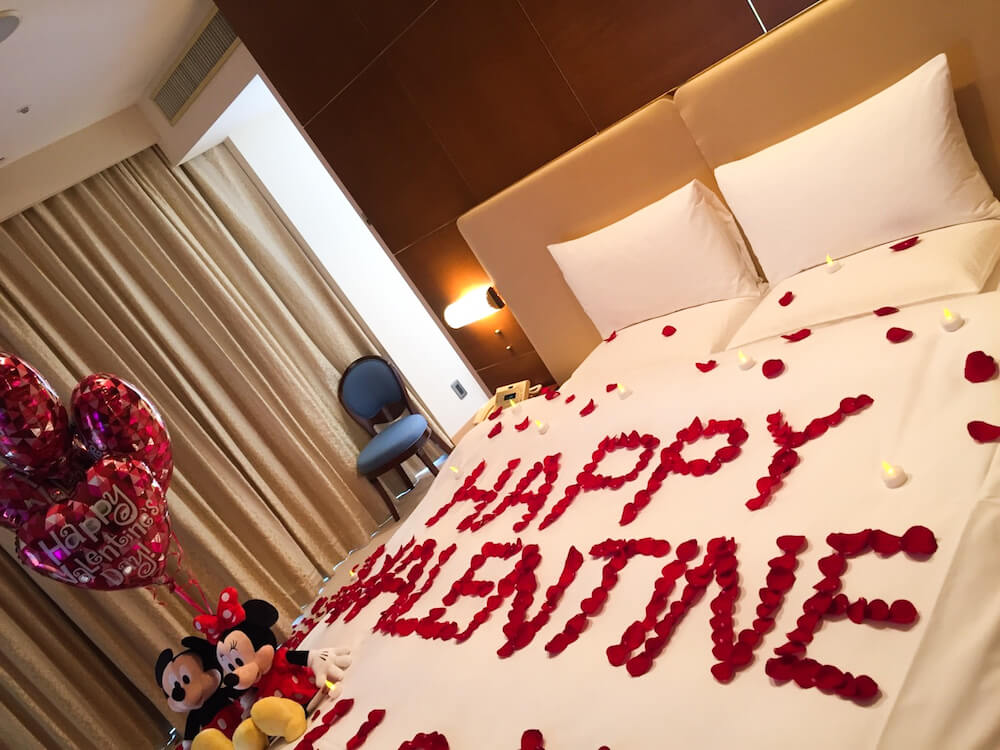 ベッドの上には“HAPPY VALENTAIN”とお二人のイニシャル、そして奥には彼氏様がご用意された大切な人へ送る花束が。サプライズと愛にあふれた素敵なプレゼントでございました。
