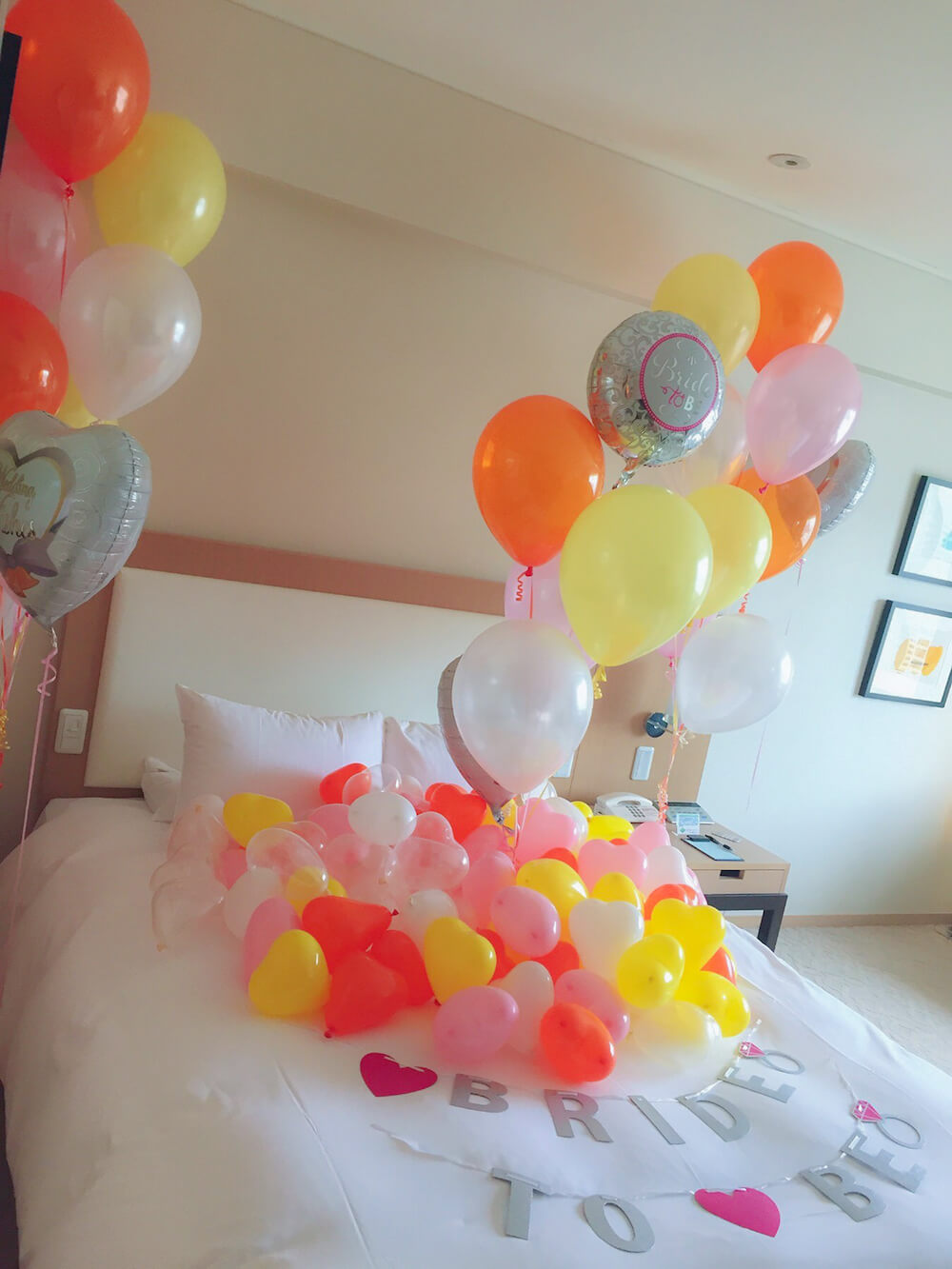 お友達同士でご宿泊されるホテルのお部屋を、温かみのある黄色オレンジを中心に可愛く装飾させていただきました。バルーン以外にもたくさんのサプライズをご用意されており、
